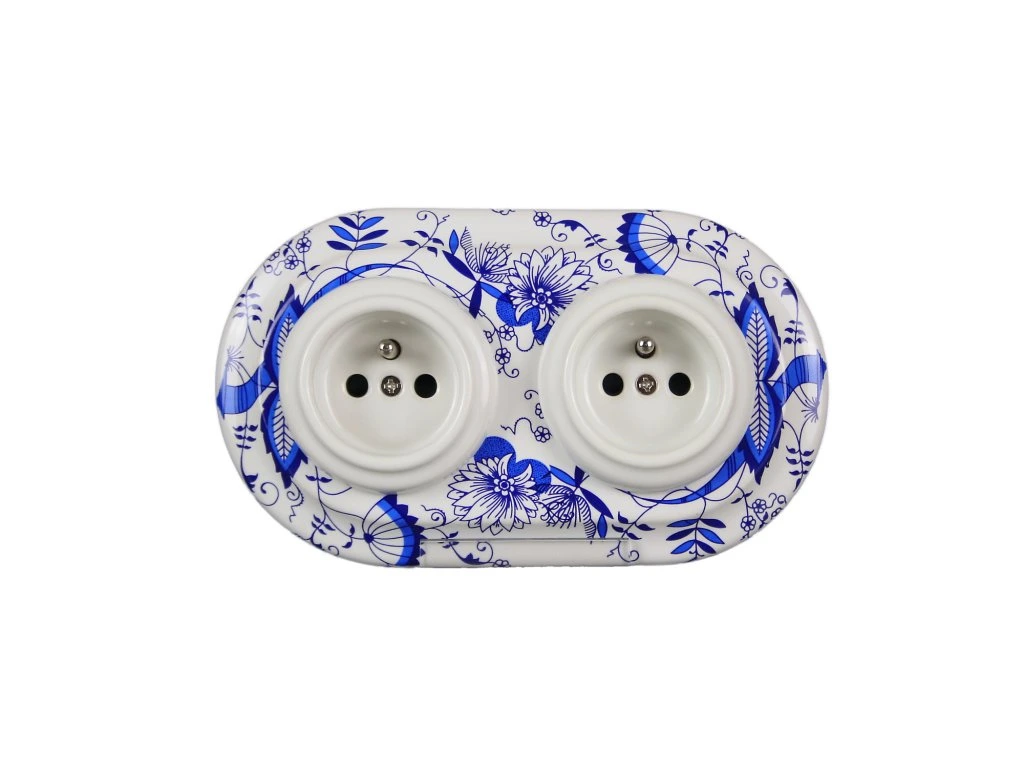 A complete, handcrafted double porcelain power socket in a classic retro style, featuring high-quality decoration fired at 820°C for exceptional durability. This Type E grounded double socket is supplied as a complete set, including the decorative porcelain frame. It is fully compatible with our entire range of retro switches and can be combined to create a unified interior design. Designed for indoor installation in standard electrical junction boxes (e.g., KP68). When using KP68 connection boxes, the required 71mm center-to-center spacing is automatically ensured.