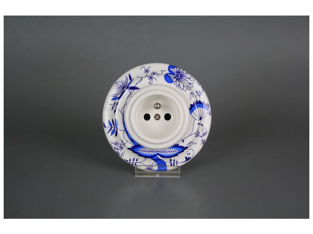 A complete, handcrafted porcelain power socket in a classic retro style, featuring high-quality decoration fired at 820°C for exceptional durability. This Type E grounded socket is designed for indoor installation in standard electrical junction boxes (e.g., KP68 – hole diameter 80mm, depth 43mm). The socket is supplied as a complete set, including the decorative porcelain frame. For multi-gang frames, a center-to-center spacing of 71mm must be maintained.