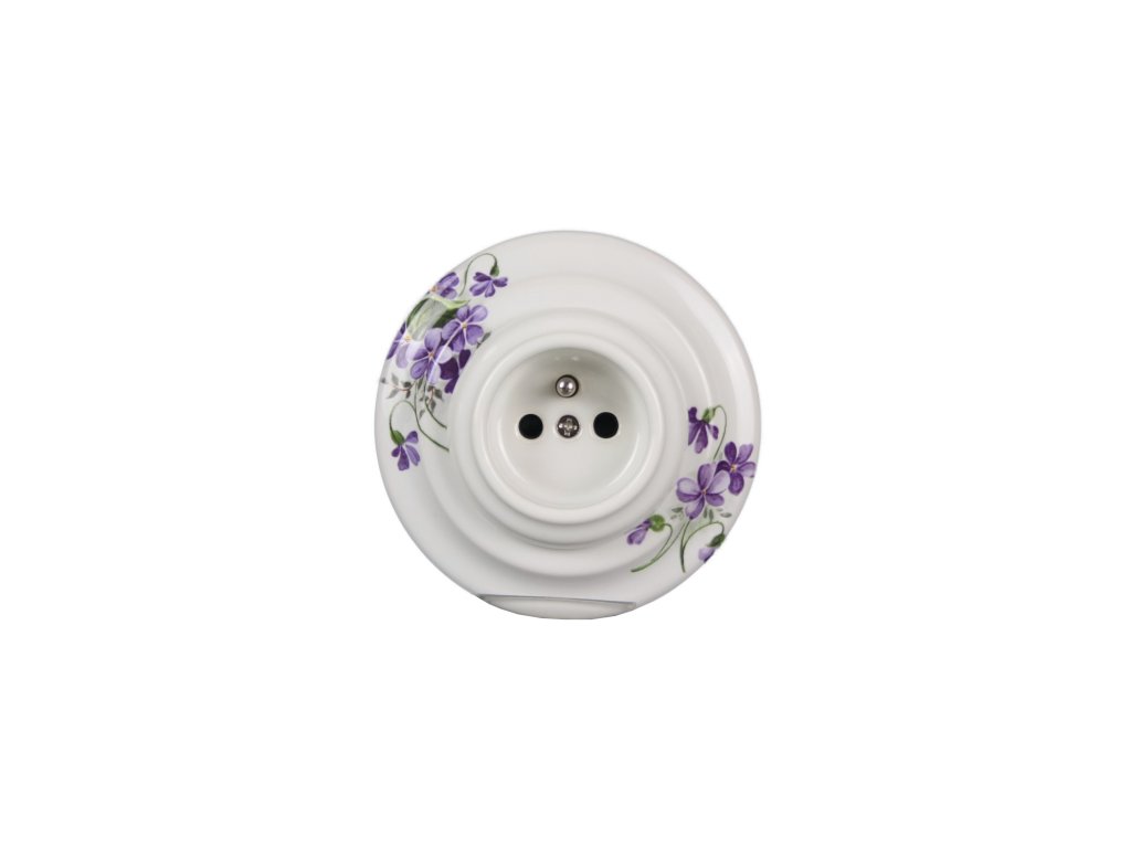 A complete, handcrafted porcelain power socket in a classic retro style, featuring high-quality decoration fired at 820°C for exceptional durability. This Type E grounded socket is designed for indoor installation in standard electrical junction boxes (e.g., KP68 – hole diameter 80mm, depth 43mm). The socket is supplied as a complete set, including the decorative porcelain frame. For multi-gang frames, a center-to-center spacing of 71mm must be maintained.