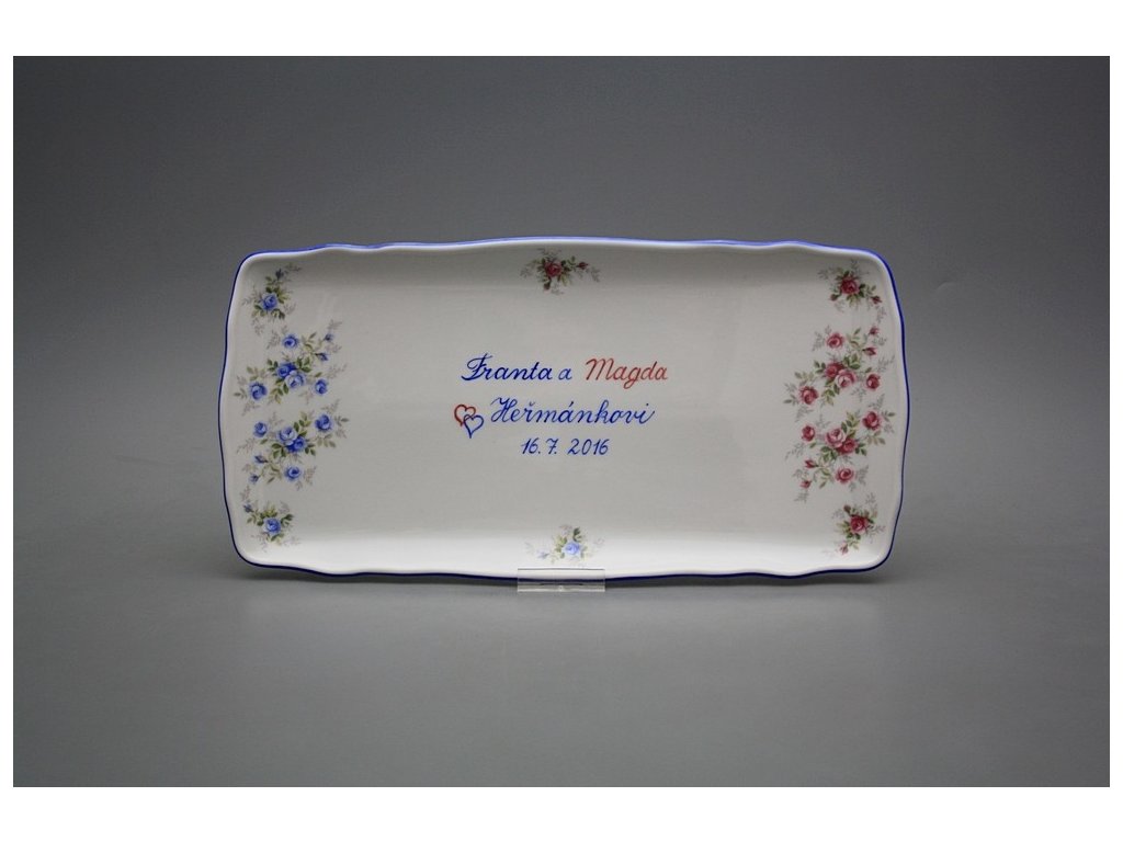 Obdélníkový podnos 36cm s věnováním z kvalitního českého porcelánu, dekorace lesklým zlatem. Nevhodný do myčky i mikrovlnné trouby.