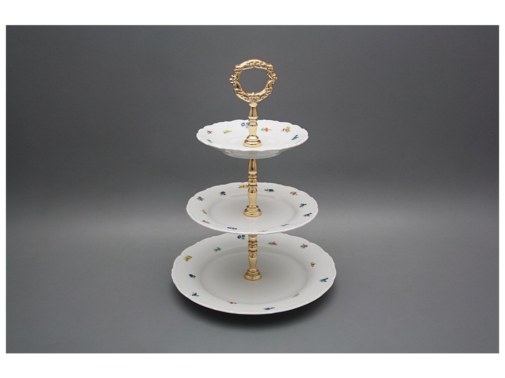 Praktický třípatrový etažer z kvalitního českého porcelánu. Vhodný do myčky. DO POZNÁMKY UVEĎTE KTEROU VARIANTU ZÁMKU POŽADUJETE (zlatý nebo stříbrný)!!!