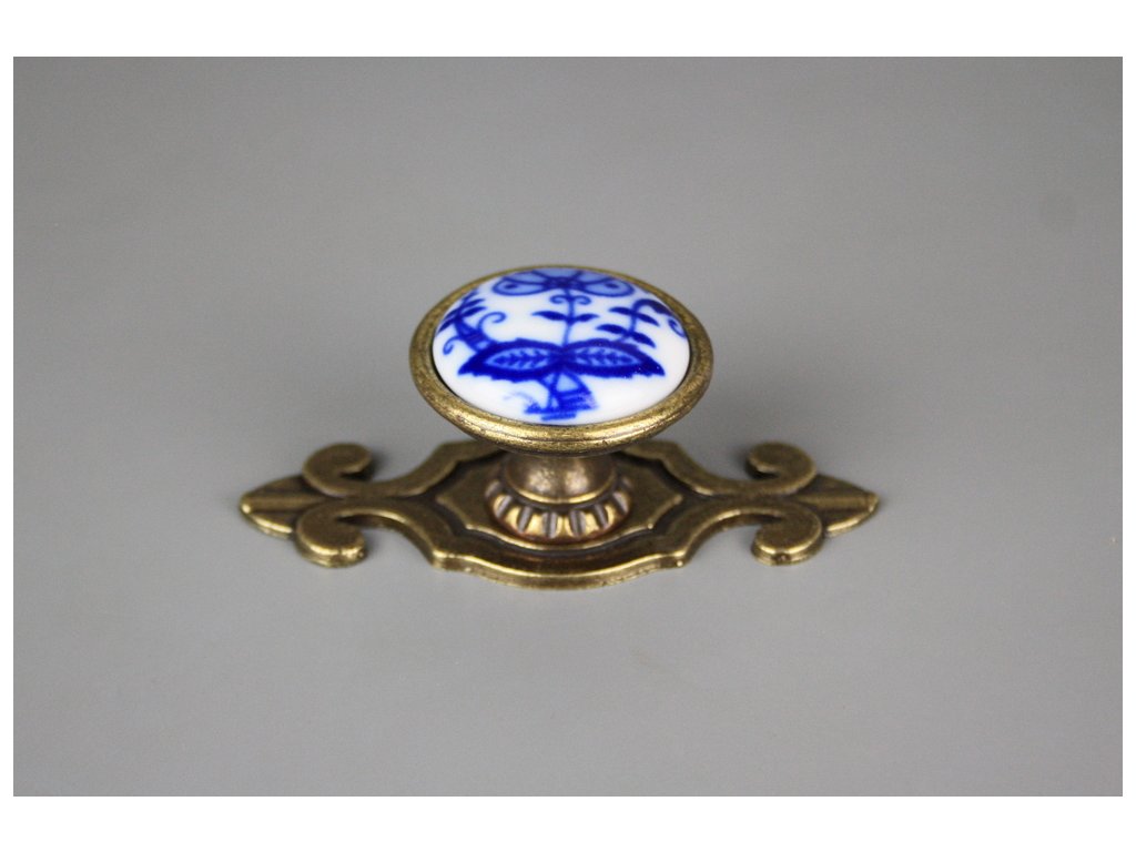 Nádherná rustikální knopka 35mm se štítem 7cm - provedení staromosaz (AM) v kombinaci s porcelánem. Jedná se o pravý karlovarský porcelán, nikoliv kameninu, přestože je mnohými výrobci mylně uváděn porcelán, pravý cibulák - teplota výpalu 1400st.C (doživotně nesmazatelný dekor). Ve spodní části je vrtaný závit M4 hluboký 15mm, součástí dodávky je lámací šroub s půlkulatou hlavou M4x20-45mm.