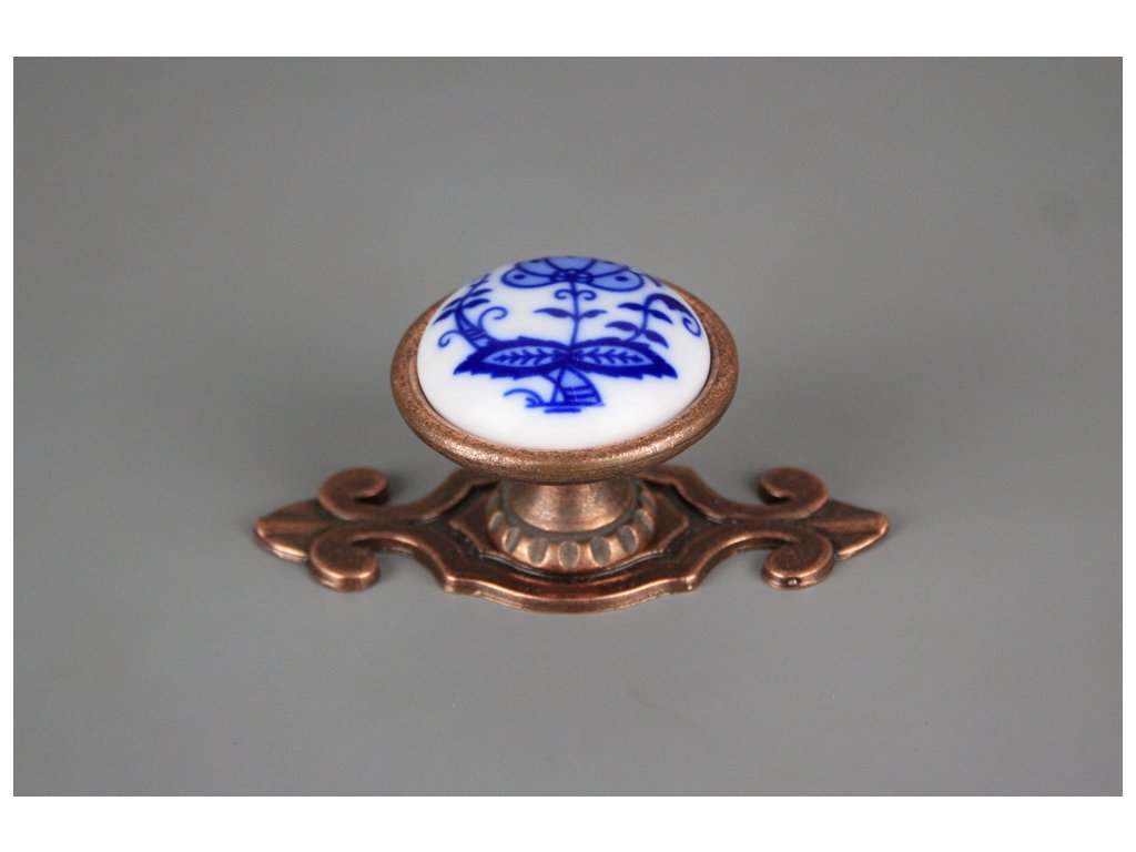 Nádherná rustikální knopka 40mm se štítem 7cm - provedení staroměď (CU) v kombinaci s porcelánem. Jedná se o pravý karlovarský porcelán, nikoliv kameninu, přestože je mnohými výrobci mylně uváděn porcelán, pravý cibulák - teplota výpalu 1400st.C (doživotně nesmazatelný dekor). Ve spodní části je vrtaný závit M4 hluboký 15mm, součástí dodávky je lámací šroub s půlkulatou hlavou M4x20-45mm.