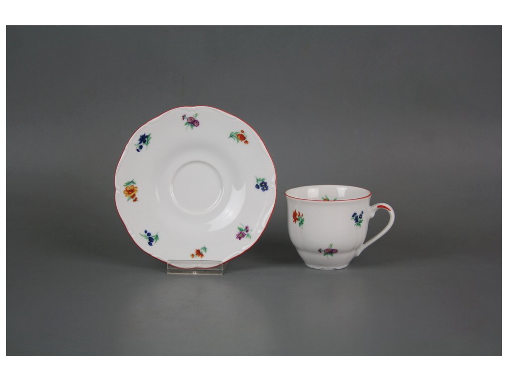 Praktický mocca šálek 80ml s podšálkem z kvalitního českého porcelánu, červený okraj (CL). Vhodný do myčky i mikrovlnné trouby.