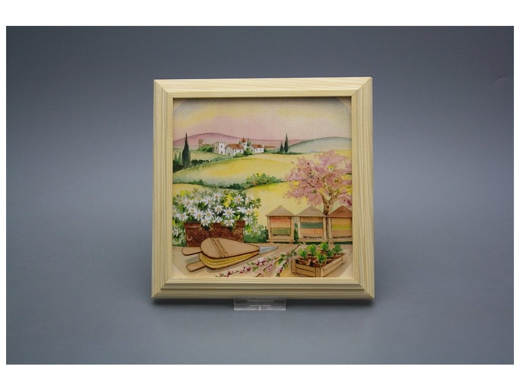 Závěsný keramický obrázek s dřevěným rámečkem, vypalovací teplota motivu 820 st.C., nesmazatelný omyvatelný dekor.
