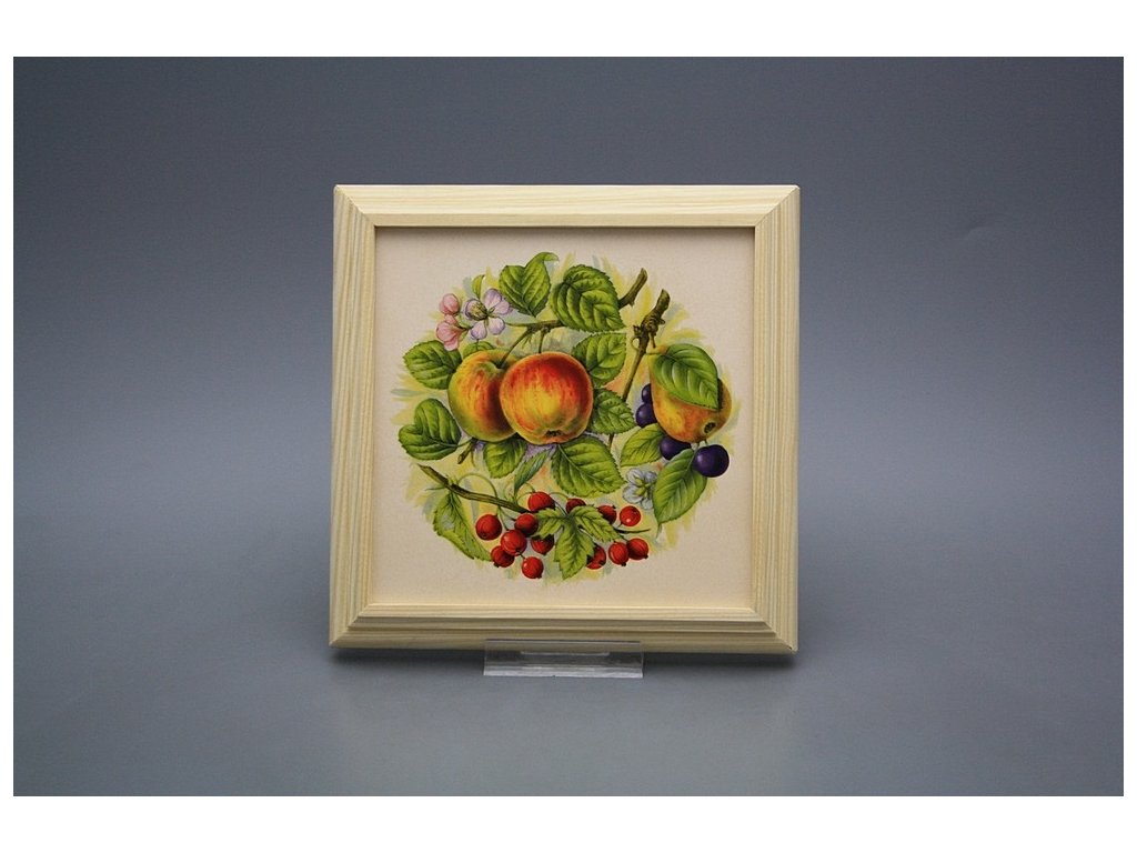 Závěsný keramický obrázek s dřevěným rámečkem, vypalovací teplota motivu 820 st.C., nesmazatelný omyvatelný dekor.