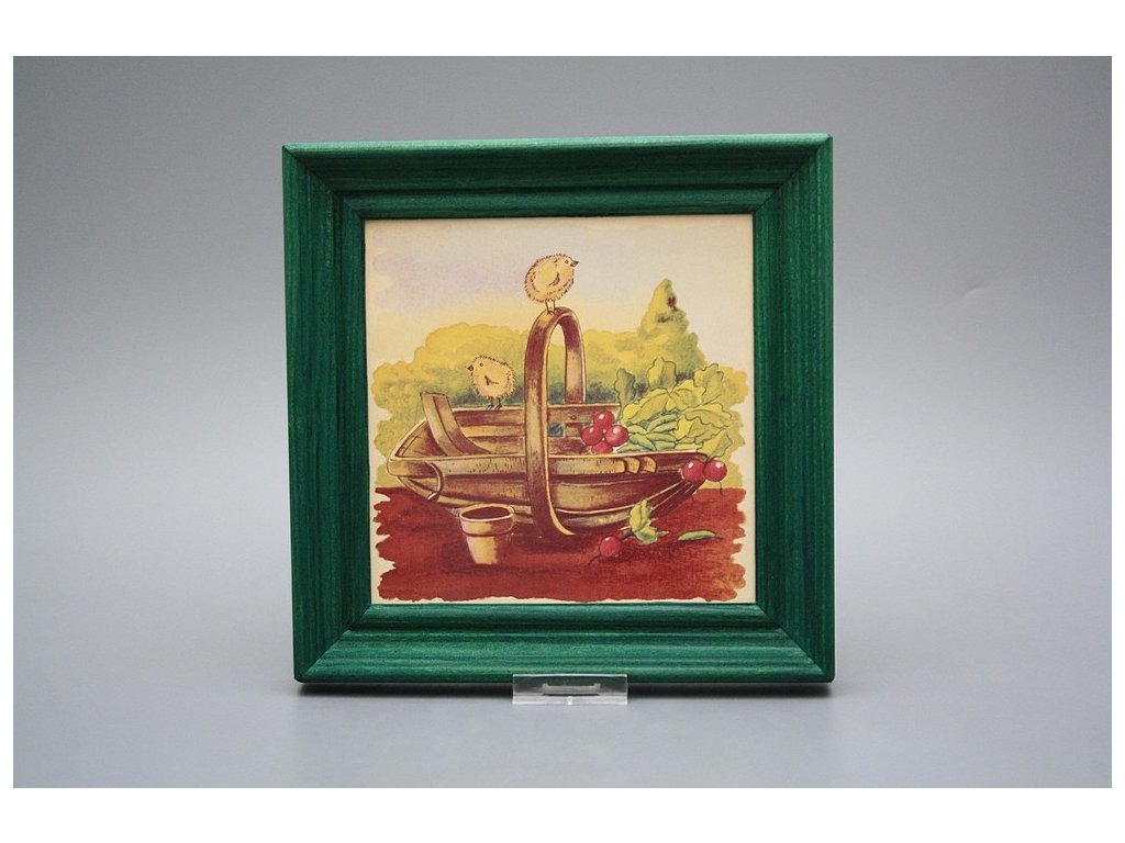 Závěsný keramický obrázek s dřevěným rámečkem, vypalovací teplota motivu 820 st.C., nesmazatelný omyvatelný dekor.