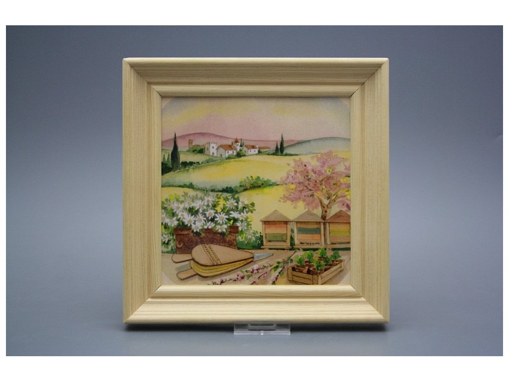 Závěsný keramický obrázek s dřevěným rámečkem, vypalovací teplota motivu 820 st.C., nesmazatelný omyvatelný dekor.