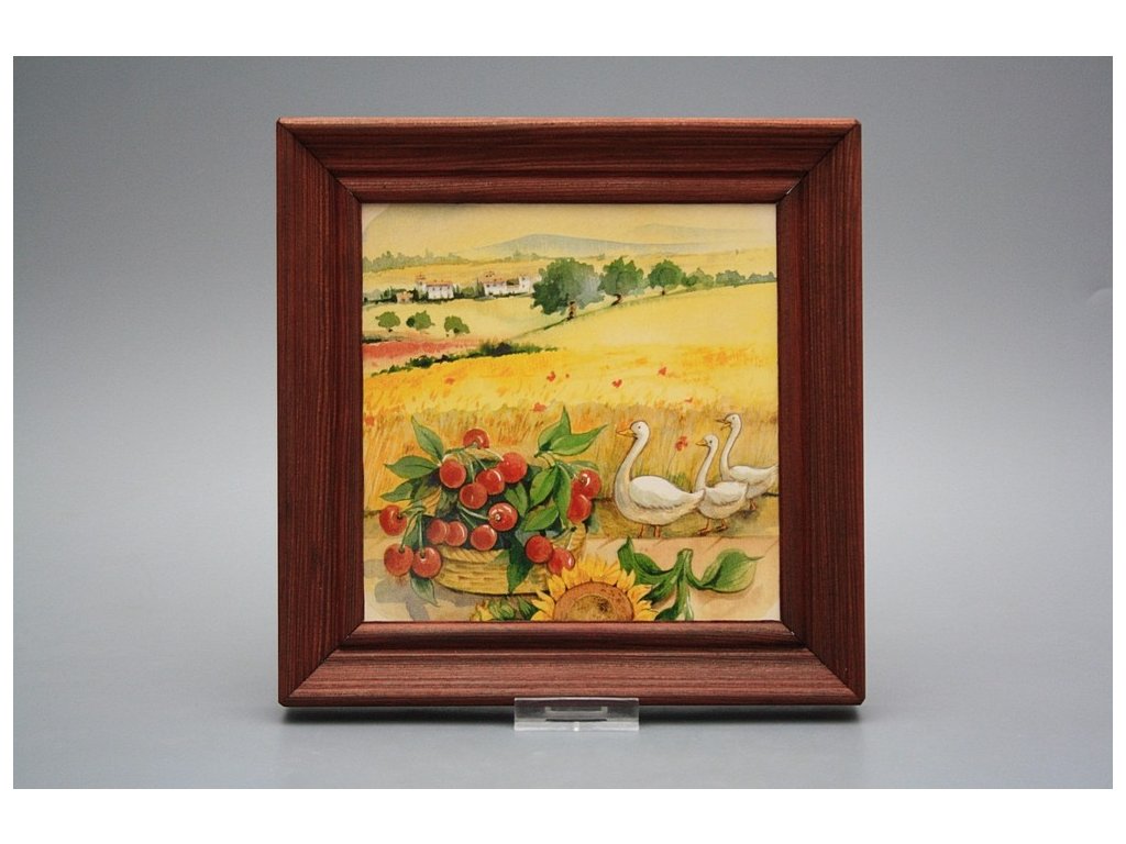 Závěsný keramický obrázek s dřevěným rámečkem, vypalovací teplota motivu 820 st.C., nesmazatelný omyvatelný dekor.