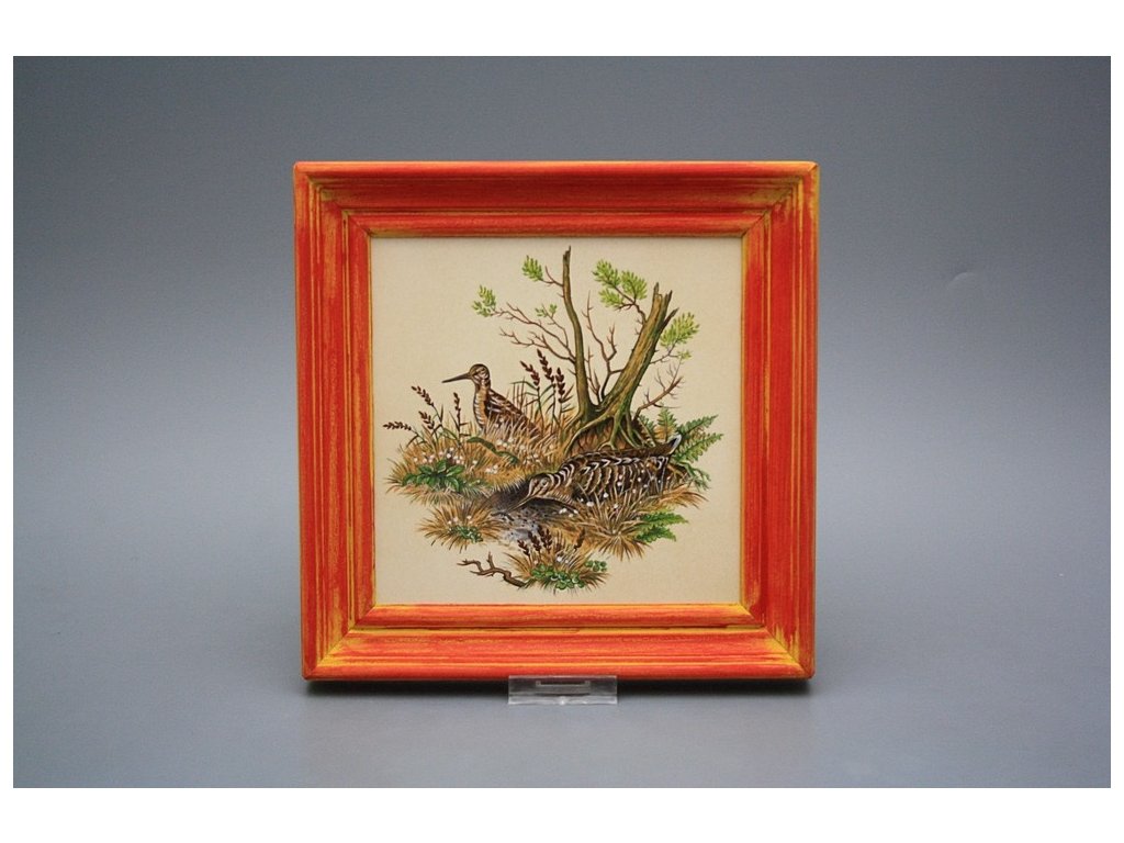 Závěsný keramický obrázek s dřevěným rámečkem, vypalovací teplota motivu 820 st.C., nesmazatelný omyvatelný dekor.