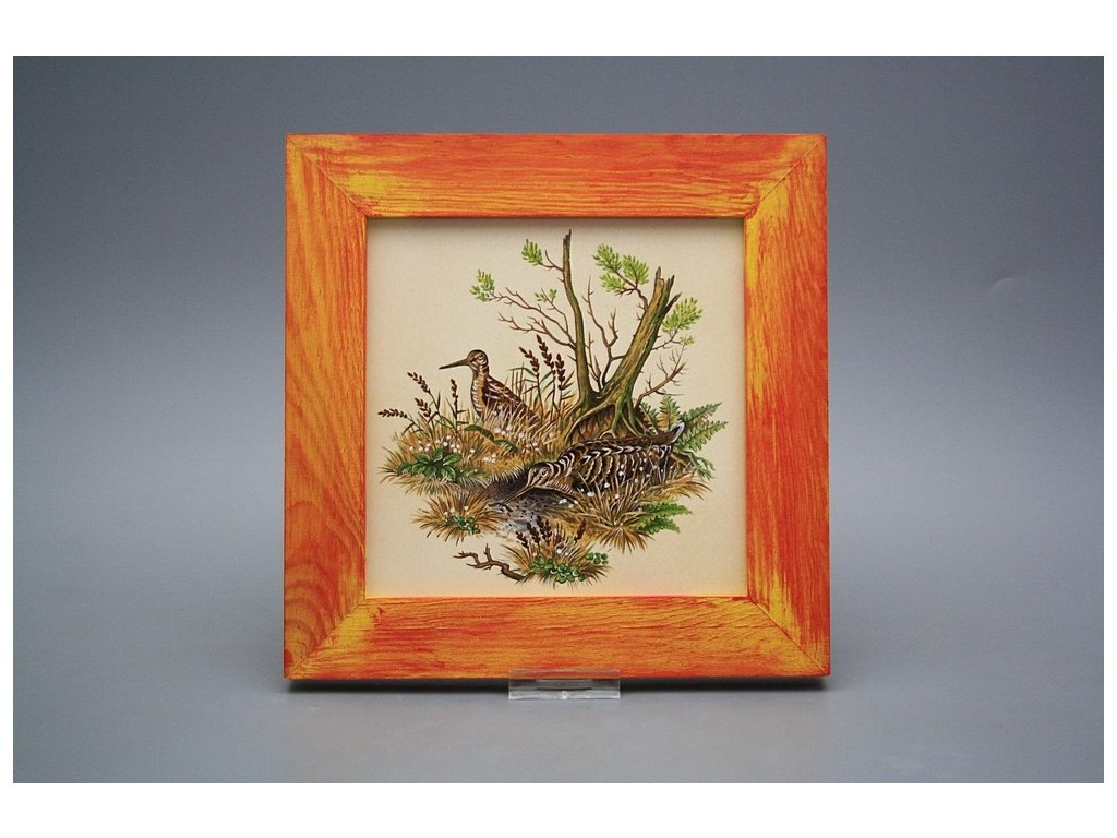 Závěsný keramický obrázek s dřevěným rámečkem, vypalovací teplota motivu 820 st.C., nesmazatelný omyvatelný dekor.
