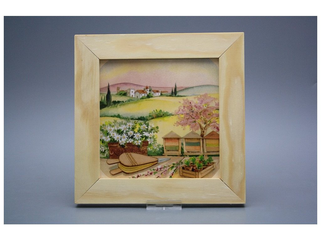Závěsný keramický obrázek s dřevěným rámečkem, vypalovací teplota motivu 820 st.C., nesmazatelný omyvatelný dekor.