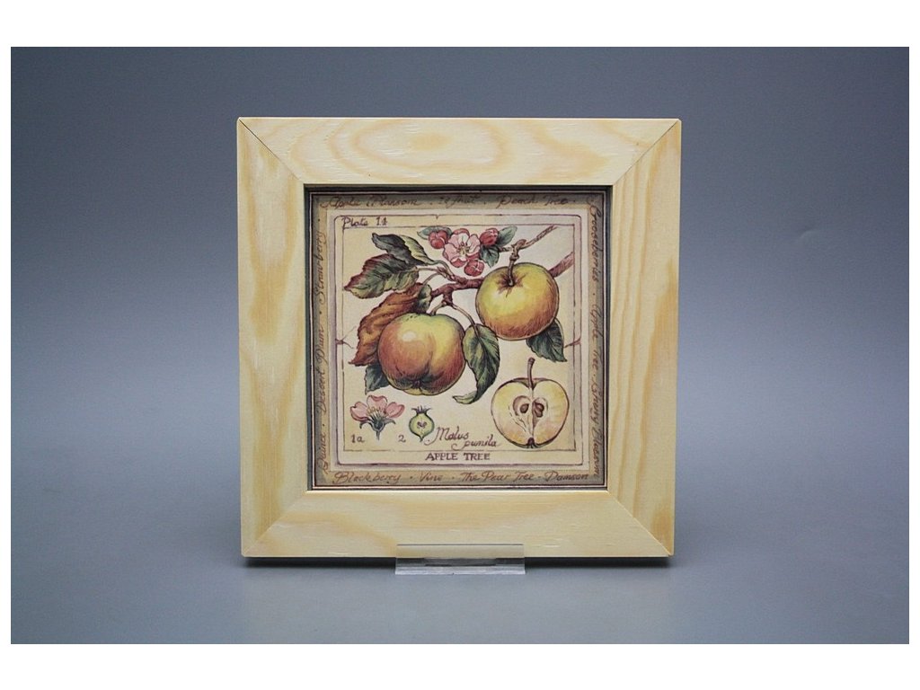 Závěsný keramický obrázek s dřevěným rámečkem, vypalovací teplota motivu 820 st.C., nesmazatelný omyvatelný dekor.