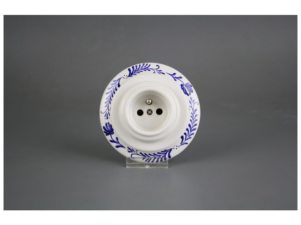Kompletní ručně vyráběná i ručně malovaná porcelánová zásuvka v retro stylu, kvalitní dekorace s teplotou výpalu 820 st. Celsia. Zásuvka je dodávána včetně rámečku a je určena pro instalaci v interiéru do klasických elektroinstalačních krabic např. KP68 - průměr vrtaného otvoru 80mm, hloubka 43mm, pro vícenásobný rámeček je nutno dodržet rozteč středů 71 mm.