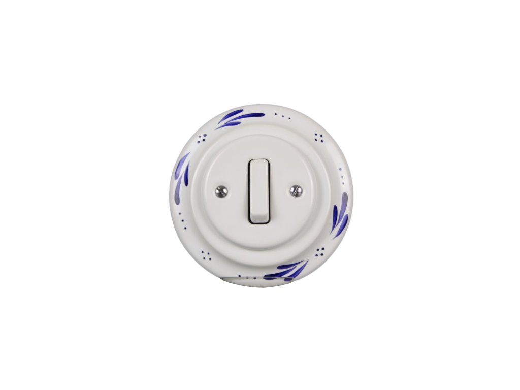 Kompletní ručně vyráběný i ručně malovaný kolébkový porcelánový vypínač č. 1 v retro stylu, kvalitní dekorace s teplotou výpalu 820 st. Celsia. Vypínač je dodáván včetně rámečku a je určen pro instalaci v interiéru do klasických elektroinstalačních krabic např. KP68 - průměr vrtaného otvoru 80mm, hloubka 43mm, pro vícenásobný rámeček je nutno dodržet rozteč středů 71 mm.