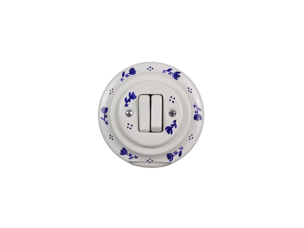 Kompletní ručně vyráběný kolébkový porcelánový vypínač č. 5 (6+6) v retro stylu, kvalitní dekorace s teplotou výpalu 820 st. Celsia. Vypínač je dodáván včetně rámečku a je určen pro instalaci v interiéru do klasických elektroinstalačních krabic, např. KP68 - průměr vrtaného otvoru 80mm, hloubka 43mm, pro vícenásobný rámeček je nutno dodržet rozteč středů 71 mm. Při použití spojovací krabice KP68 je tato potřebná rozteč zajištěna.