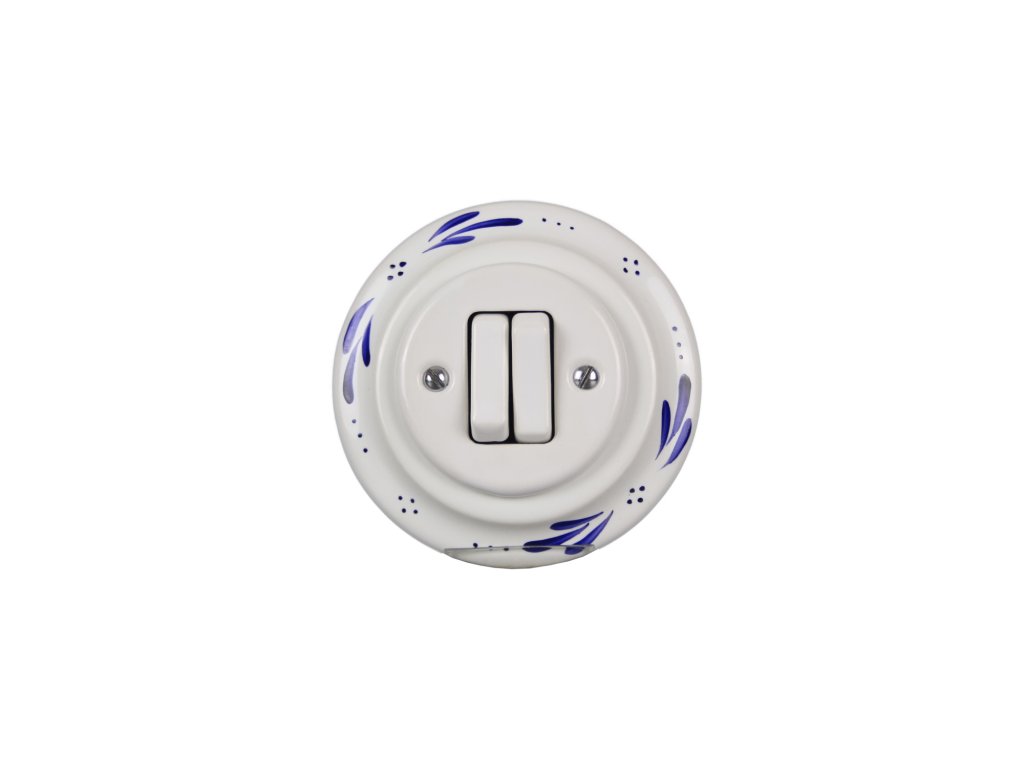 Kompletní ručně vyráběný i malovaný kolébkový porcelánový vypínač č. 5 (6+6) v retro stylu, kvalitní dekorace s teplotou výpalu 820 st. Celsia. Vypínač je dodáván včetně rámečku a je určen pro instalaci v interiéru do klasických elektroinstalačních krabic, např. KP68 - průměr vrtaného otvoru 80mm, hloubka 43mm, pro vícenásobný rámeček je nutno dodržet rozteč středů 71 mm. Při použití spojovací krabice KP68 je tato potřebná rozteč zajištěna.