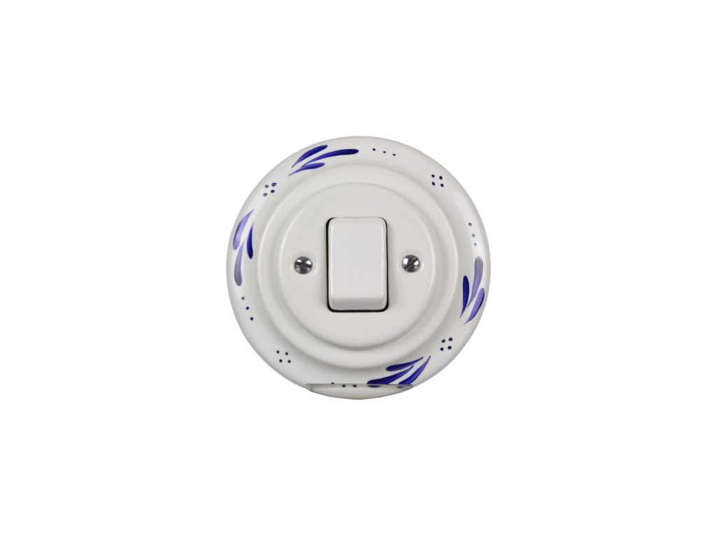 Kompletní ručně vyráběný i ručně malovaný kolébkový porcelánový vypínač č. 7 v retro stylu, kvalitní dekorace s teplotou výpalu 820 st. Celsia. Vypínač je dodáván včetně rámečku a je určen pro instalaci v interiéru do klasických elektroinstalačních krabic např. KP68 - průměr vrtaného otvoru 80mm, hloubka 43mm, pro vícenásobný rámeček je nutno dodržet rozteč středů 71 mm.
