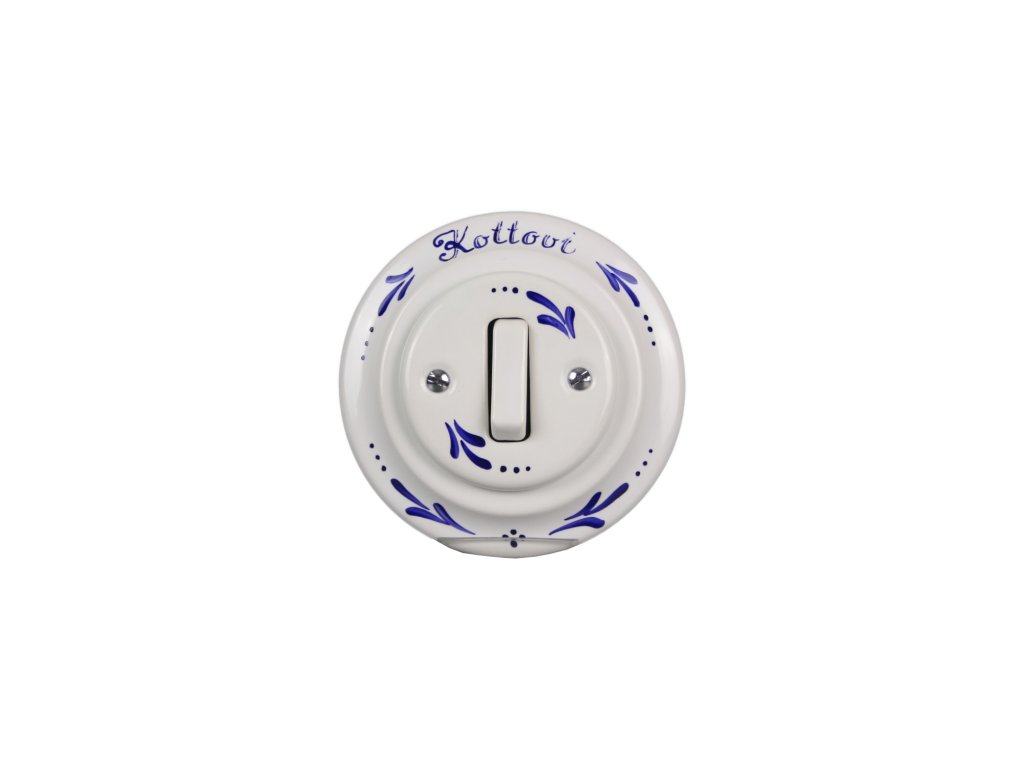 Kompletní ručně vyráběný i ručně malovaný kolébkový porcelánový zvonkový vypínač v retro stylu, kvalitní dekorace s teplotou výpalu 820 st. Celsia. Vypínač je dodáván včetně rámečku a je určen pro instalaci do klasických elektroinstalačních krabic např. KP68 - průměr vrtaného otvoru 80mm, hloubka 43mm, pro vícenásobný rámeček je nutno dodržet rozteč středů 71 mm, vysoká odolnost proti otěru.
