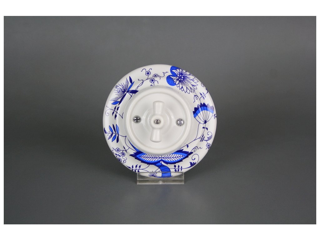 Kompletní ručně vyráběný otočný porcelánový vypínač zvonkový v retro stylu, kvalitní dekorace s teplotou výpalu 820 st. Celsia. Vypínač je dodáván včetně rámečku a je určen pro instalaci v interiéru do klasických elektroinstalačních krabic např. KP68 - průměr vrtaného otvoru 80mm, hloubka 43mm, pro vícenásobný rámeček je nutno dodržet rozteč středů 71 mm.