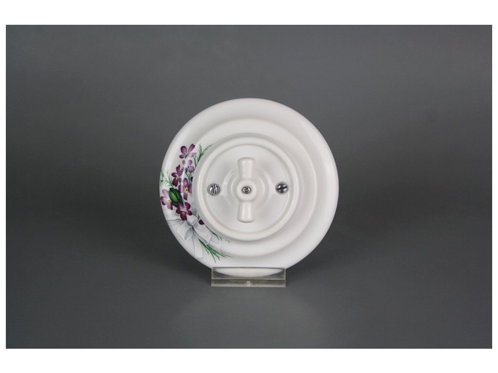 Kompletní ručně vyráběný otočný porcelánový vypínač zvonkový v retro stylu, kvalitní dekorace s teplotou výpalu 820 st. Celsia. Vypínač je dodáván včetně rámečku a je určen pro instalaci v interiéru do klasických elektroinstalačních krabic např. KP68 - průměr vrtaného otvoru 80mm, hloubka 43mm, pro vícenásobný rámeček je nutno dodržet rozteč středů 71 mm.