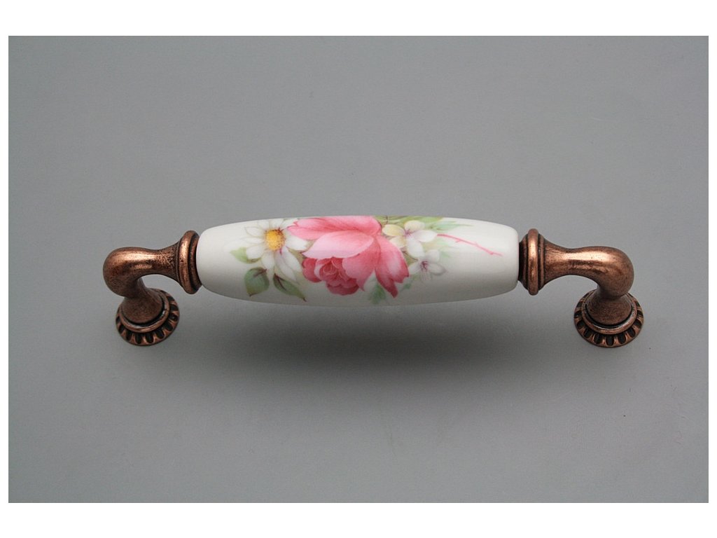 Luxury combined rustic brass handle - pitch of 128mm, design of old copper in combination with porcelain. Included with delivery is 2x Snap off screw (M4 thread, M4x20, 45mm length).