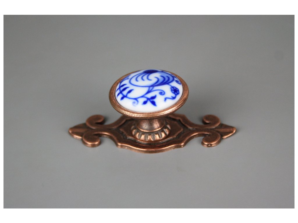 Nádherná rustikální mosazná úchytka 35mm se štítem 7cm - provedení staroměď v kombinaci s porcelánem. Jedná se o pravý karlovarský porcelán, nikoliv kameninu, přestože je mnohými výrobci mylně uváděn porcelán, pravý cibulák - teplota výpalu 1400st.C (doživotně nesmazatelný dekor). Ve spodní části je vrtaný závit M4 hluboký 15mm, součástí dodávky je lámací šroub s půlkulatou hlavou M4x20-45mm.