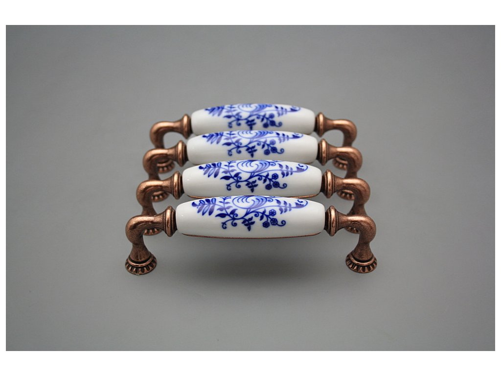 Nádherná 4dílná sada kombinovaných rustikálních úchytek - rozteč 128mm, provedení staroměď (CU) v kombinaci s porcelánem, cibulák, pravý kobalt (teplota výpalu 1400 st.C, nesmazatelný dekor). Ve spodních částech jsou vrtané závity M4 hluboké 15mm. Součástí dodávky je 8x lámací šroub s půlkulatou hlavou M4x20-45mm.
