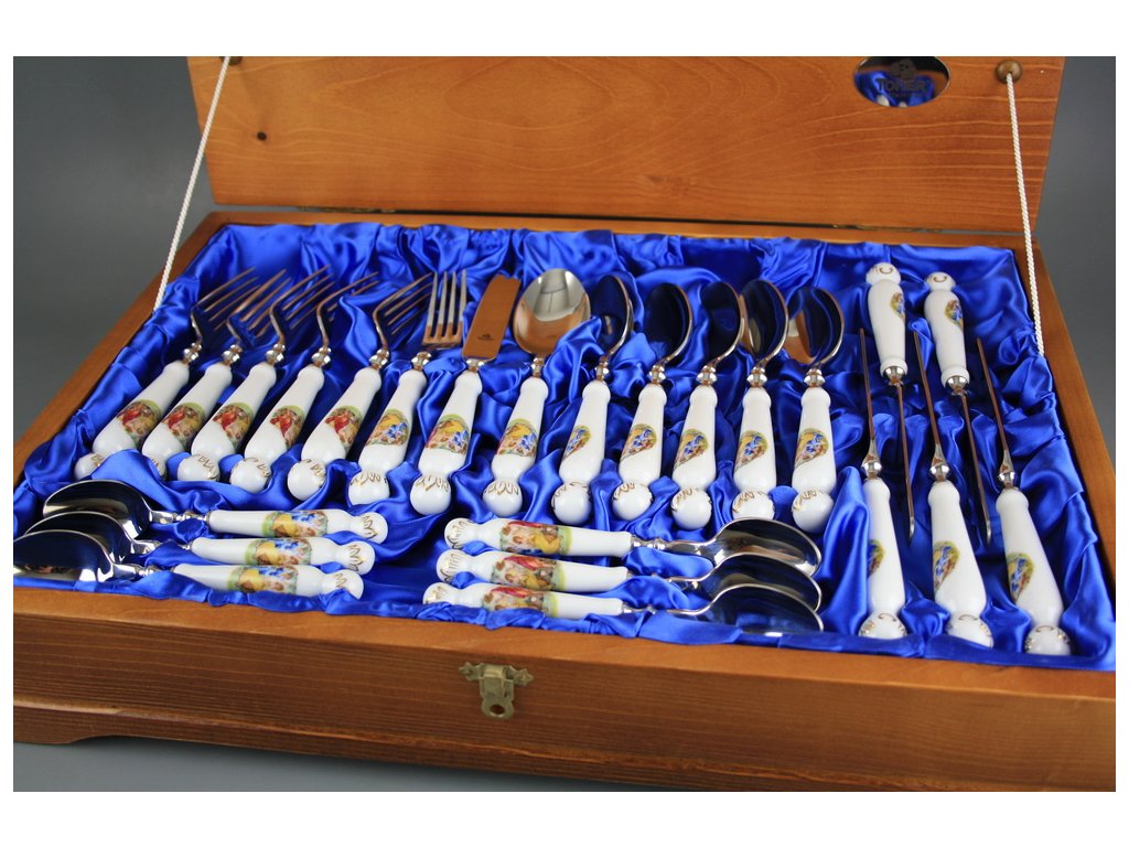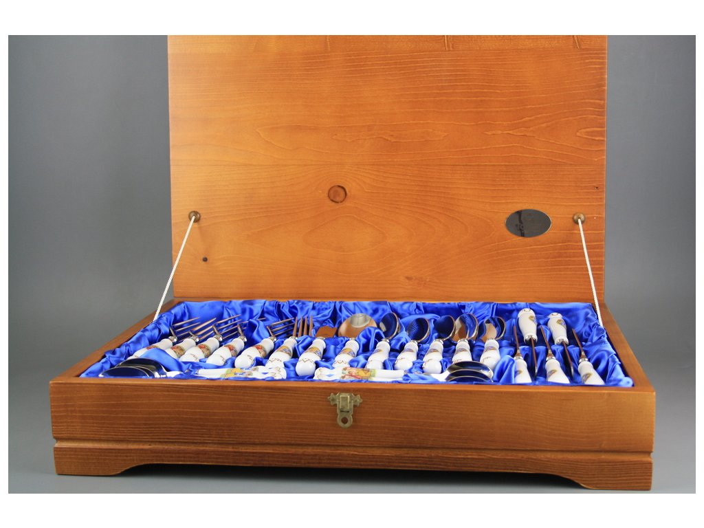 Luxury 24-piece set of cutlery with a thick-walled porcelain handles of hard porcelain, including a luxurious wooden box with satin lining and decorative fittings.