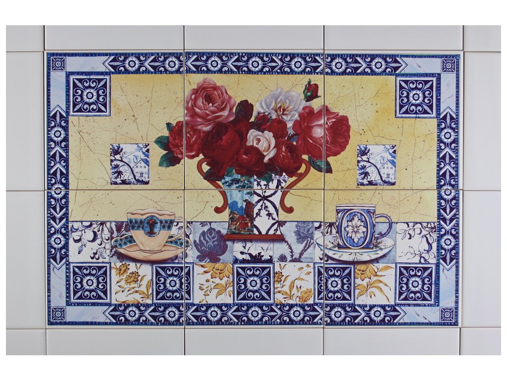 Decorated ceramic painting, 45x30cm, made up of 6 tiles (each 15x15cm) from Czech manufacturer RAKO. Fired at 820°C for a durable, washable finish. Decorated using COLOR ONE ceramic tiles with a glossy, white surface.