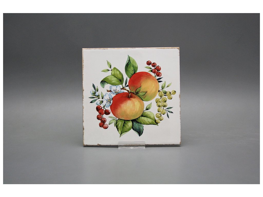 Decorated ceramic tile, 15x15cm, in retro style from the Spanish manufacturer FABRESA. Fired at a temperature of 820°C for a durable, washable finish. FORLI BLANCO ceramic tiles were used for decoration, featuring a glossy, white, aged surface.