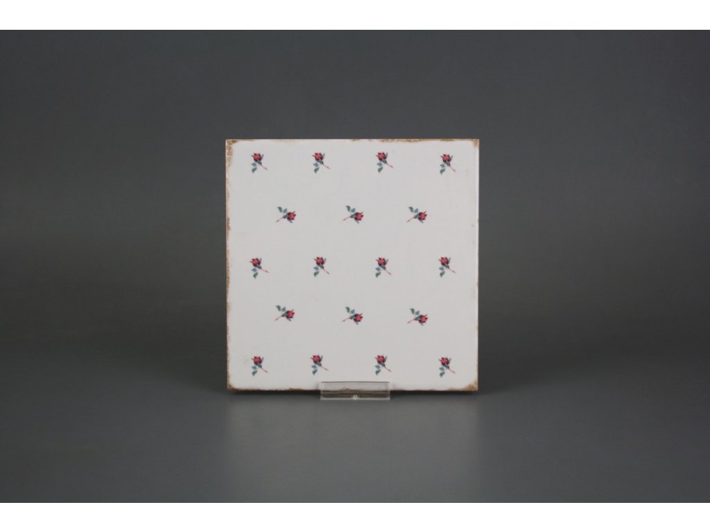Decorated ceramic tile, 15x15cm, in retro style from the Spanish manufacturer FABRESA. Fired at a temperature of 820°C for a durable, washable finish. FORLI BLANCO ceramic tiles were used for decoration, featuring a glossy, white, aged surface.