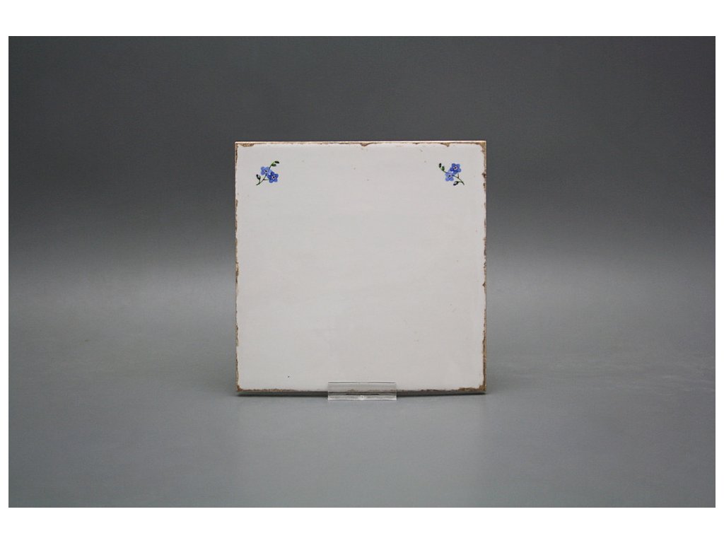 Decorated ceramic tile, 15x15cm, in retro style from the Spanish manufacturer FABRESA. Fired at a temperature of 820°C for a durable, washable finish. FORLI BLANCO ceramic tiles were used for decoration, featuring a glossy, white, aged surface.