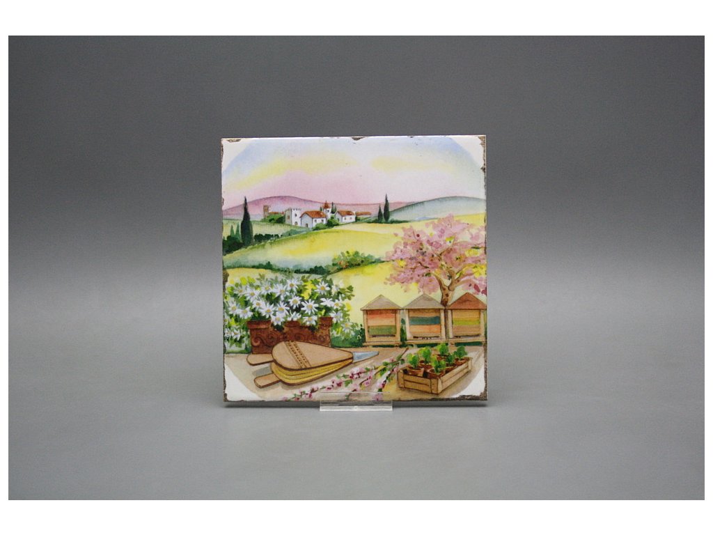 Decorated ceramic tile, 15x15cm, in retro style from the Spanish manufacturer FABRESA. Fired at a temperature of 820°C for a durable, washable finish. FORLI BLANCO ceramic tiles were used for decoration, featuring a glossy, white, aged surface.