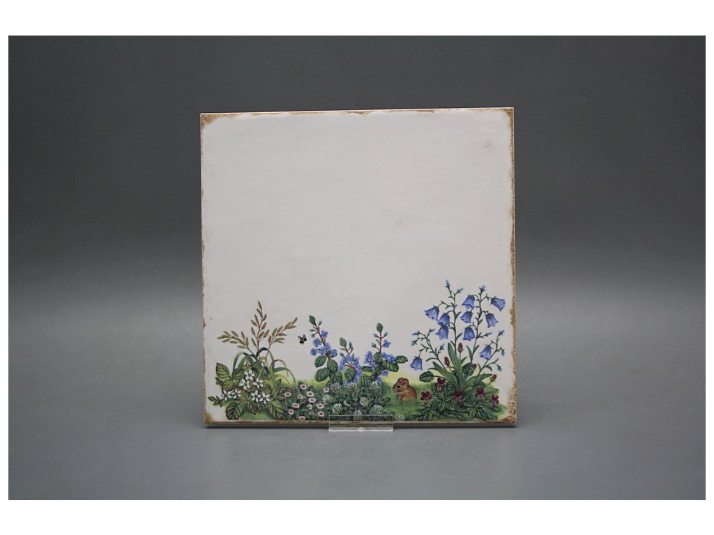 Decorated ceramic tile, 20x20cm, in retro style from the Spanish manufacturer FABRESA. Fired at a temperature of 820°C for a durable, washable finish. FORLI BLANCO ceramic tiles were used for decoration, featuring a glossy, white, aged surface.
