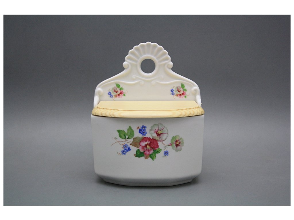 Practical wall box for foodstuffs with wooden cover of high-quality Czech porcelain.
