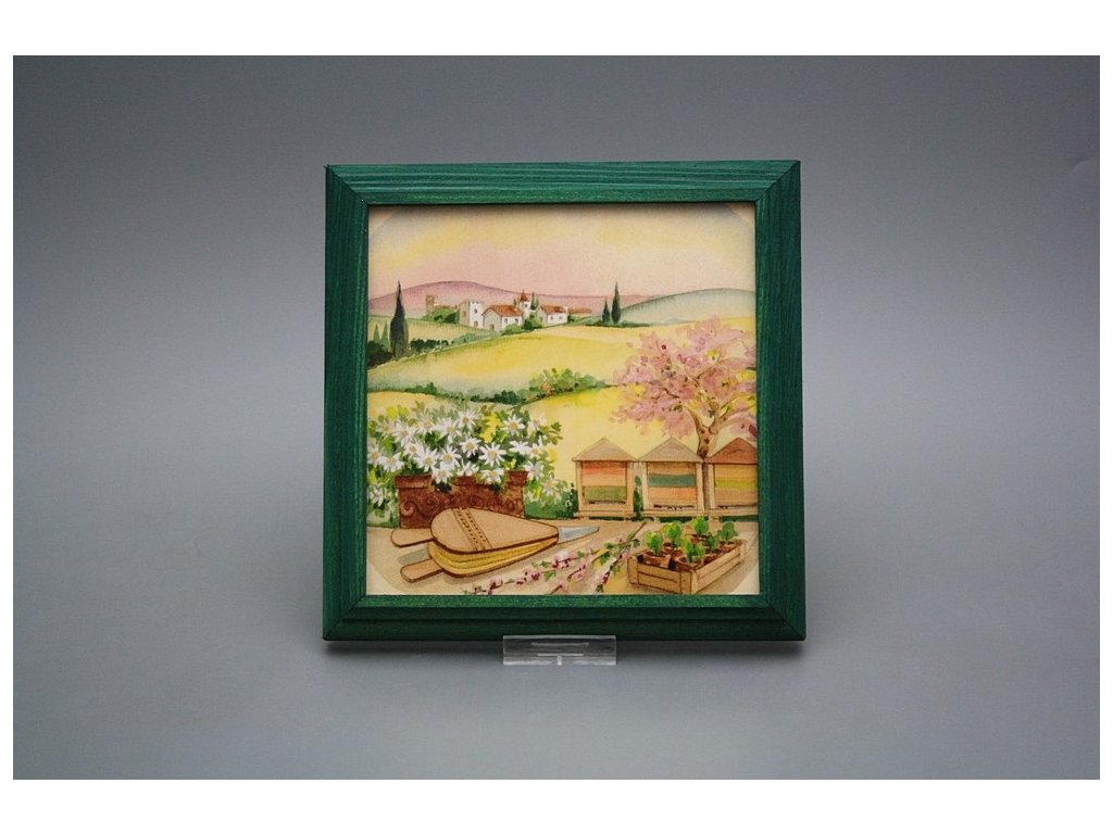 Závěsný keramický obrázek s dřevěným rámečkem, vypalovací teplota motivu 820 st.C., nesmazatelný omyvatelný dekor.