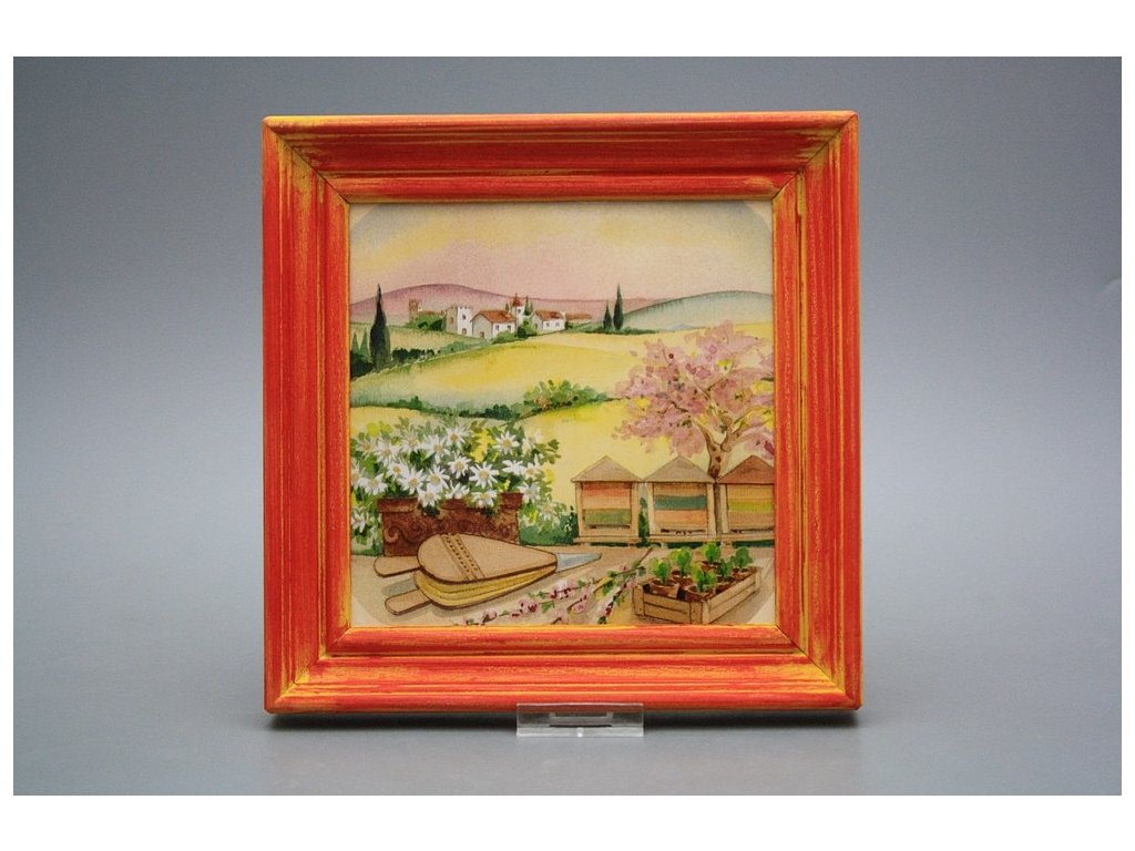 Hanging ceramic picture with a red mottled wood frame (CM). Motif fired at 820°C, ensuring a permanent and washable decor.