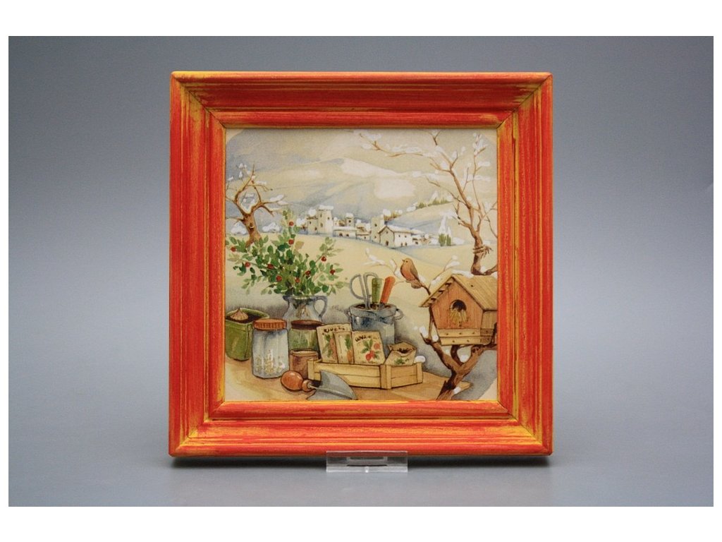 Hanging ceramic picture with a red mottled wood frame (CM). Motif fired at 820°C, ensuring a permanent and washable decor.